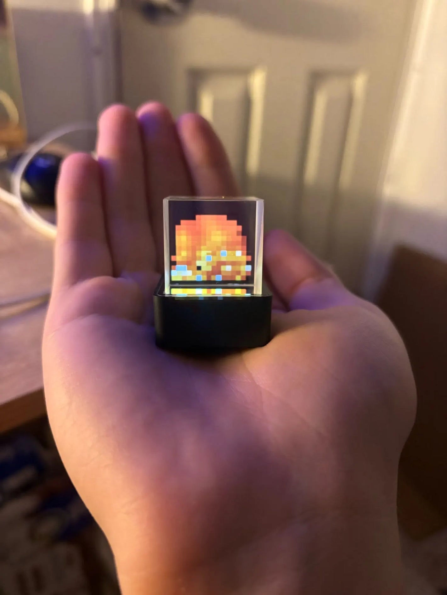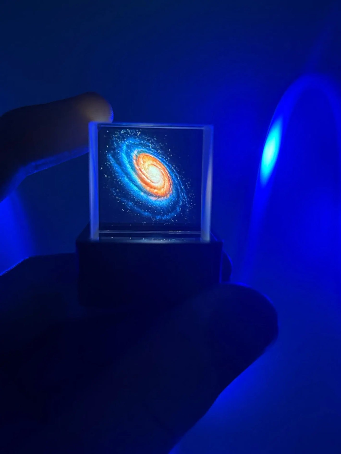 El AuraCube es compacto y ligero, ideal para escritorios, estanterías o mesas de noche. Su tamaño total es de 31 mm x 35 mm x 38 mm, con un prisma óptico de 25,4 mm por lado que genera el efecto holográfico.